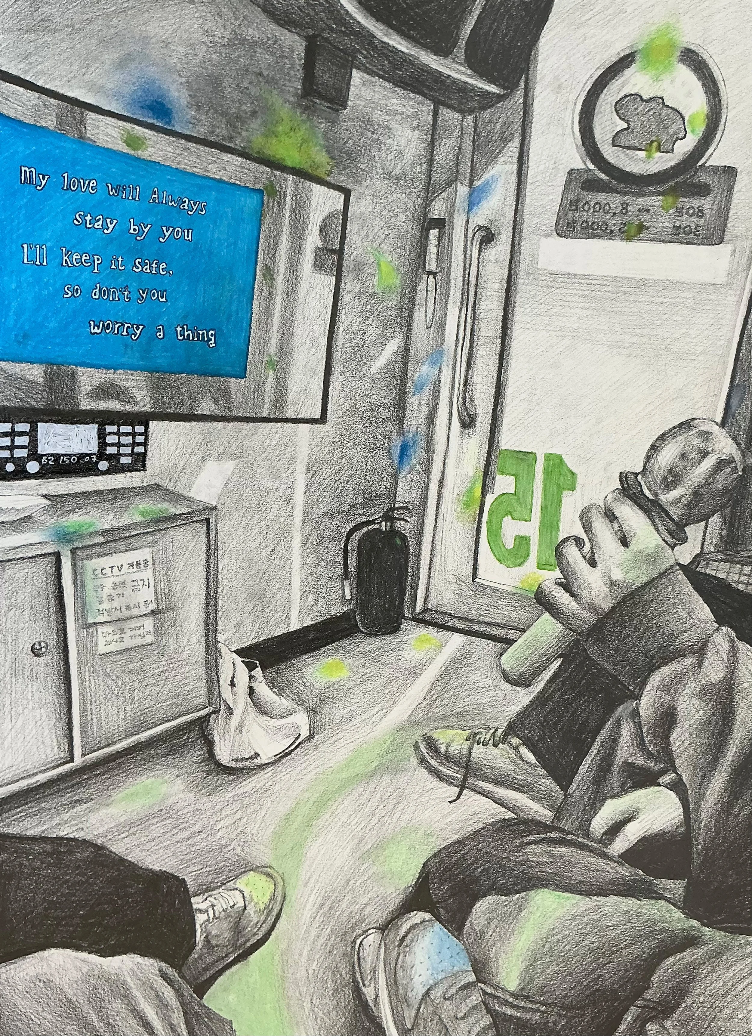 The glowing lyrics across the screen and the relaxed postures of the figures indicate the way music can soothe even in times of final or other stresses. Karaoke reunites friends who may be struggling separately find themselves together again in the same room, sharing the same song. This piece shows how these small, familiar spaces become emotional shelters, reminding us that even in hard moments, we are not alone.